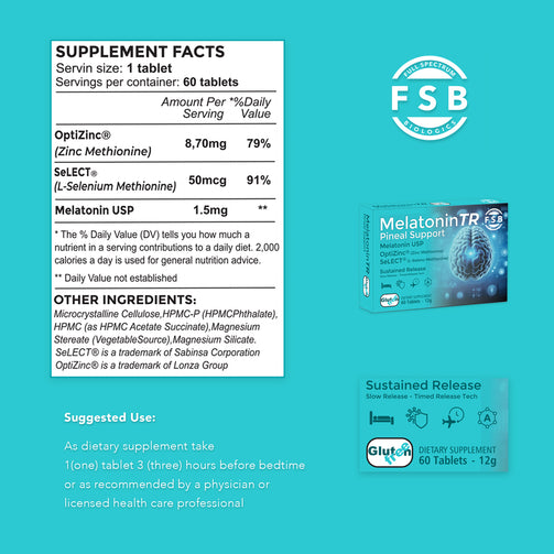 MelatoninTR™ is a next-generation sleep and pineal-support formula engineered for people who demand more than ordinary melatonin. This scientifically designed supplement combines Melatonin USP with two of the most bioavailable and research-backed minerals available today: OptiZinc® (Zinc Methionine) and SeLECT® (L-Selenomethionine) — all delivered through an advanced sustained-release technology that works gradually throughout the night.
